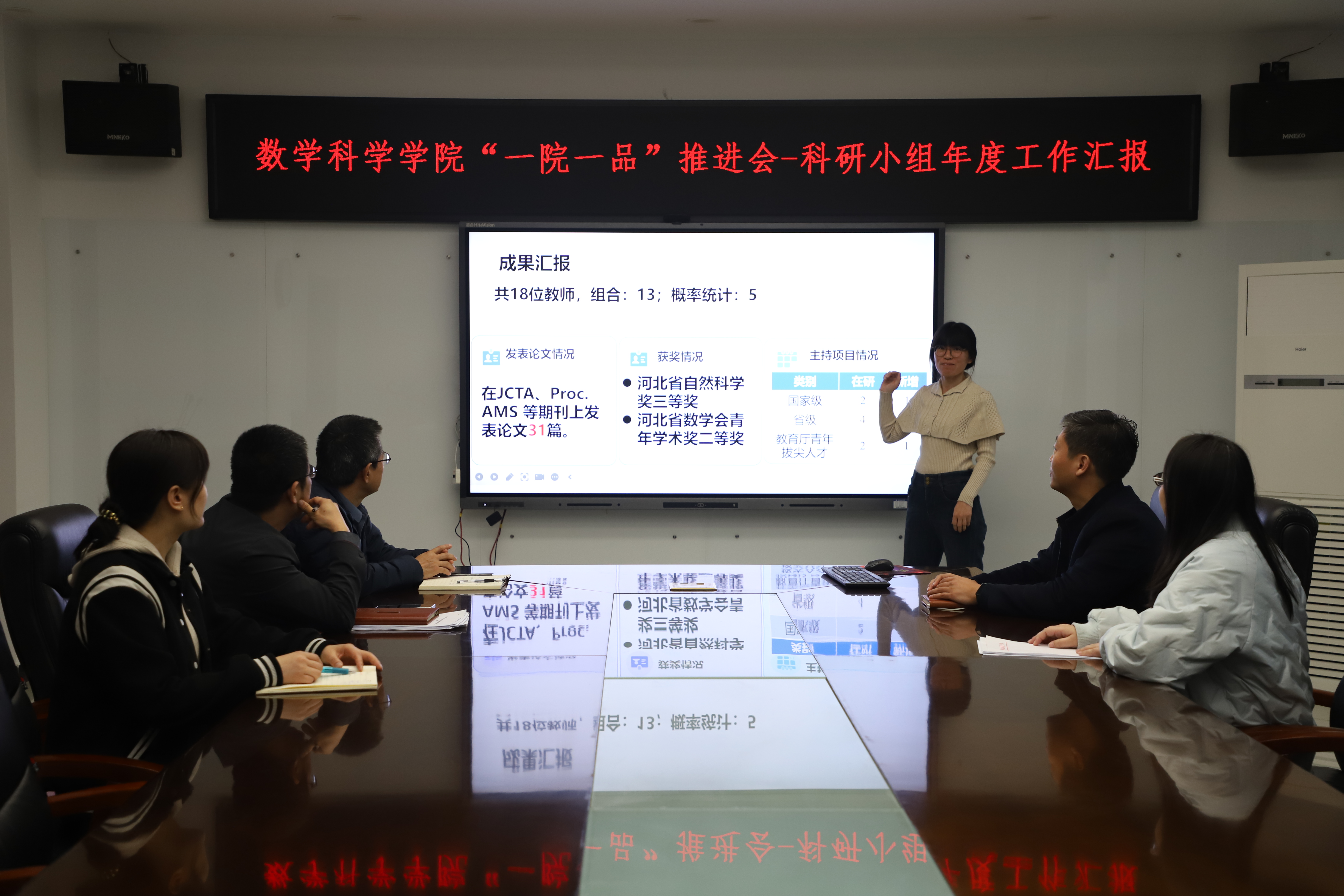 会上,学院六个科研小组依次汇报,围绕研究方向、阶段性成果、后续规划及品牌融合思路展开详细阐述。自项目开展以来,累计发表论文53篇、邀请专家作报告111次、参加学术会议171次,充分展现了各团队深耕科研、务实笃行的良好风貌,也为学院“一院一品”工作注入了鲜活的科研动能。